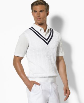 cable-knit v-neck sweatervest over a polo--popped collar optional--and rocks a